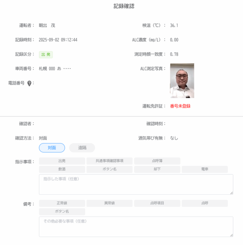 ドライバーの測定データはオペレーターが管理画面から「登録写真」と「ALC測定写真(測定時の顔写真)」で本人を確認、なりすましを防止