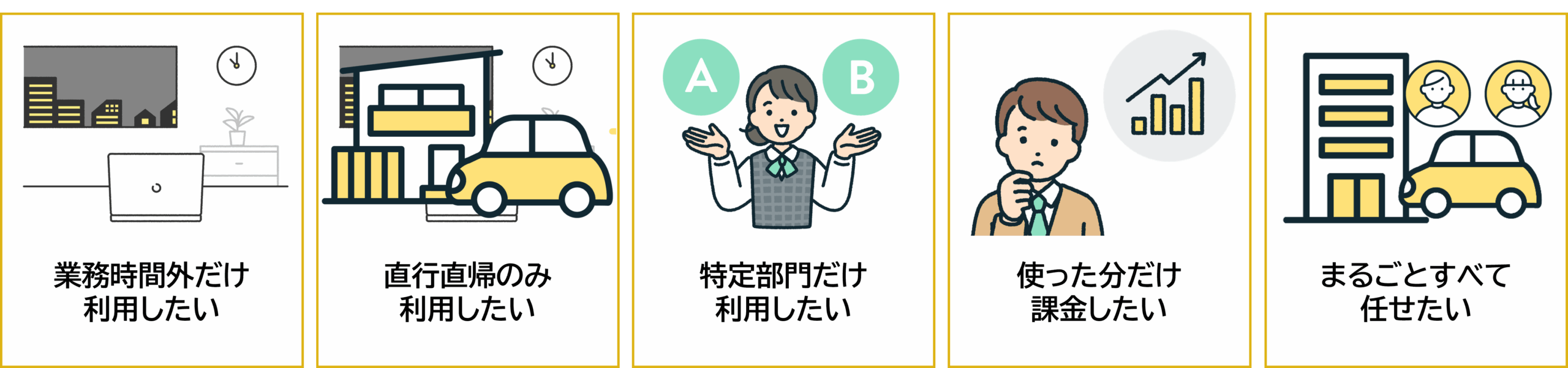 「早朝・深夜・休日だけ利用したい」「使った分だけ」「まるごとお任せ。かけ放題で利用したい」等、様々なニーズがありますが、それに沿ったサービスが見つからないといった課題もあります