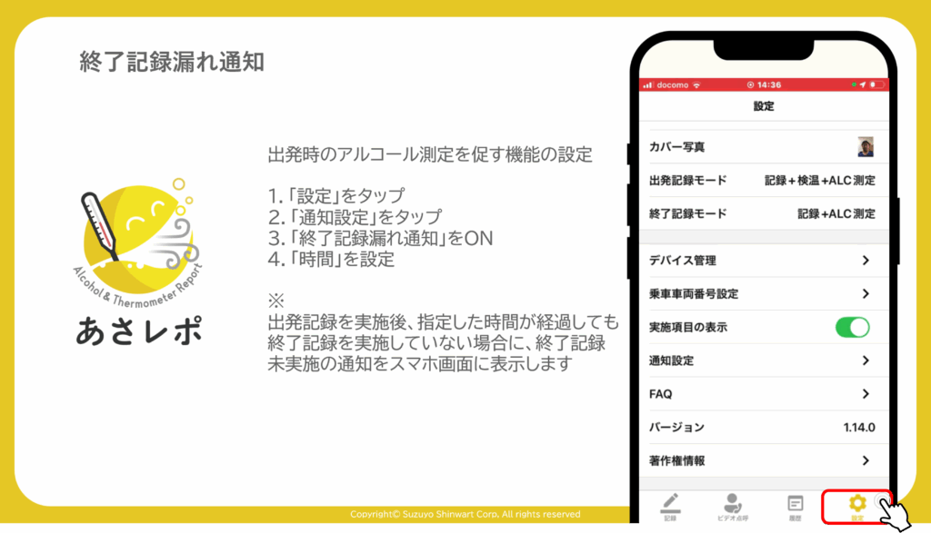 3.「終了記録漏れ通知」をON