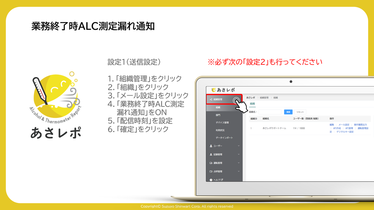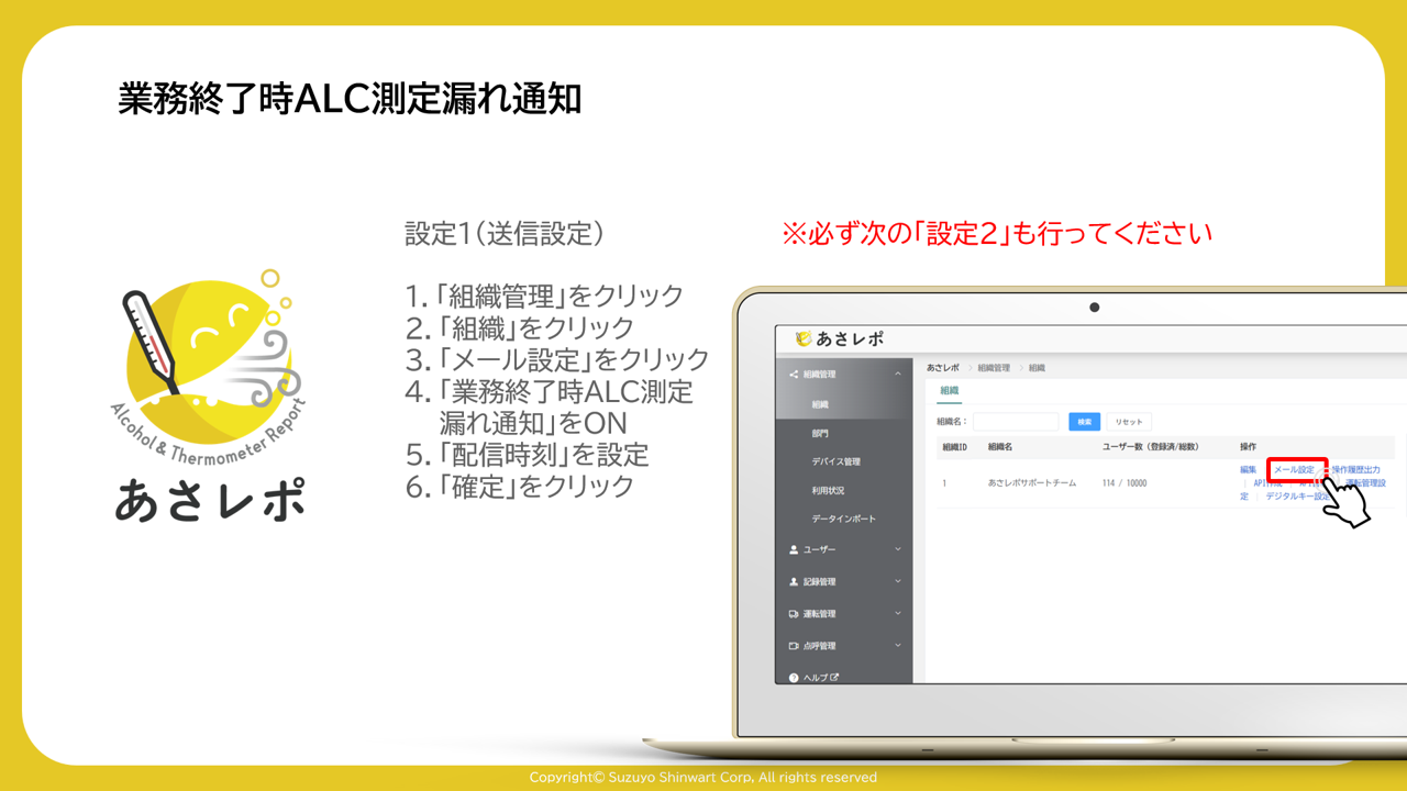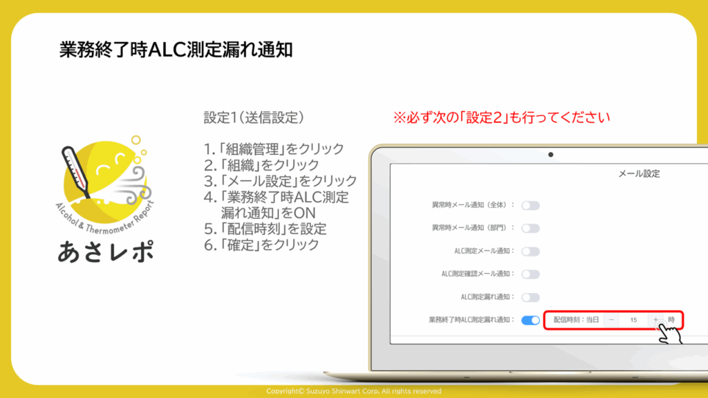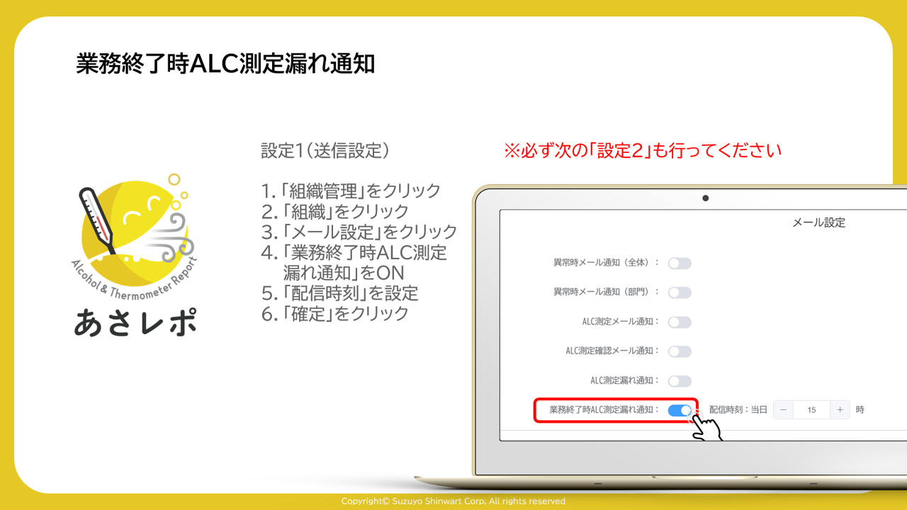 4.「業務終了時ALC測定・漏れ通知」をON
