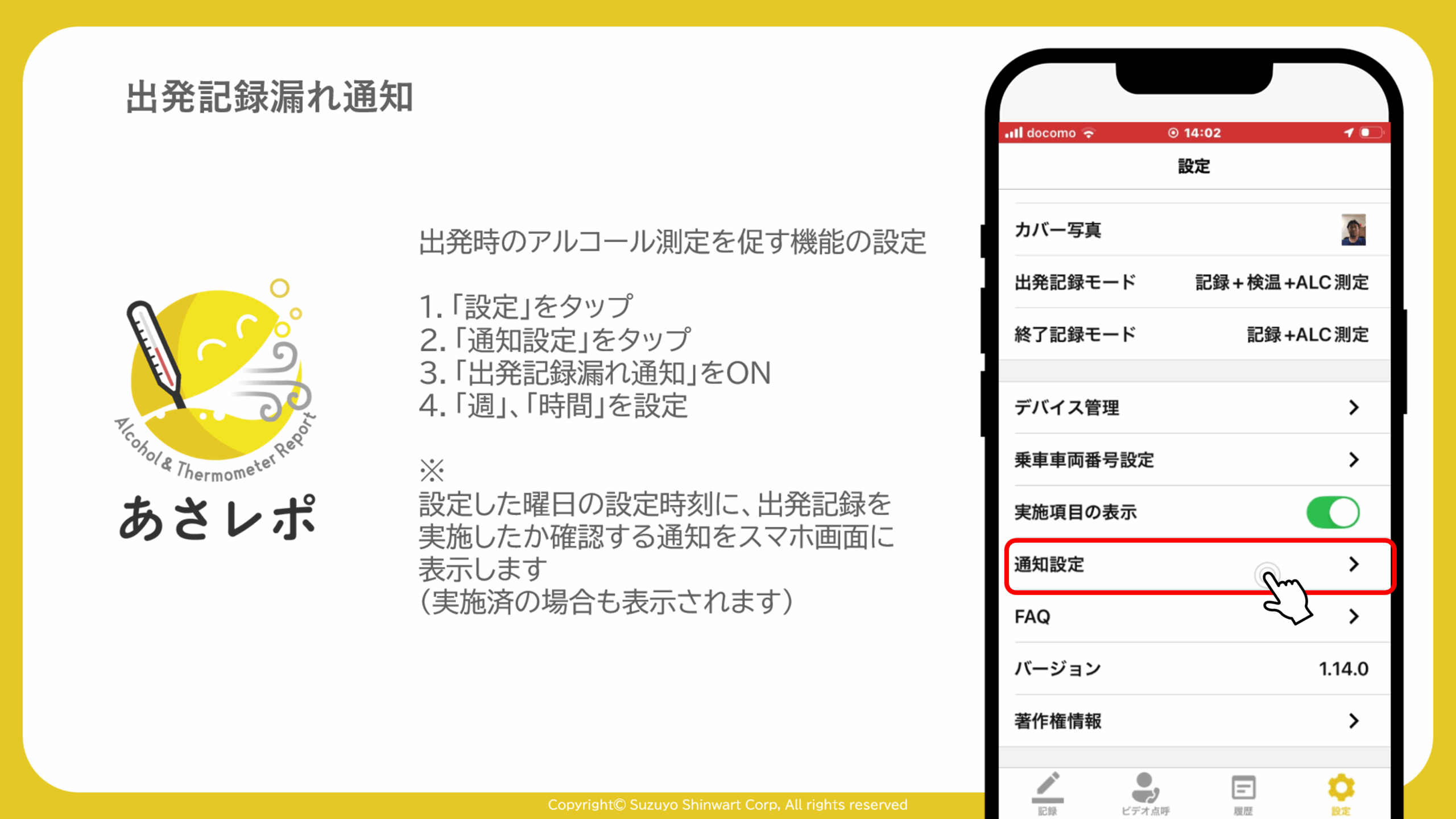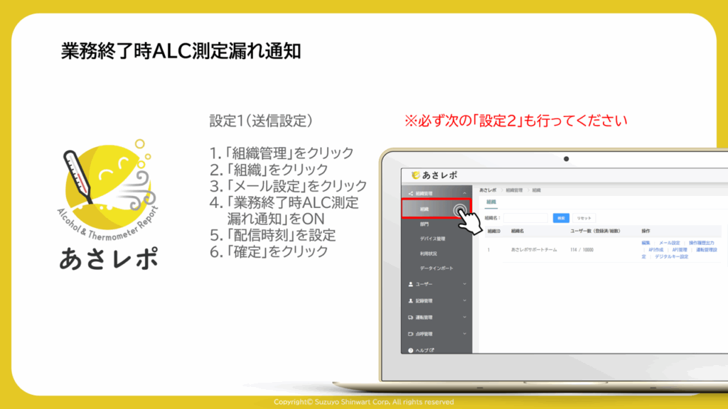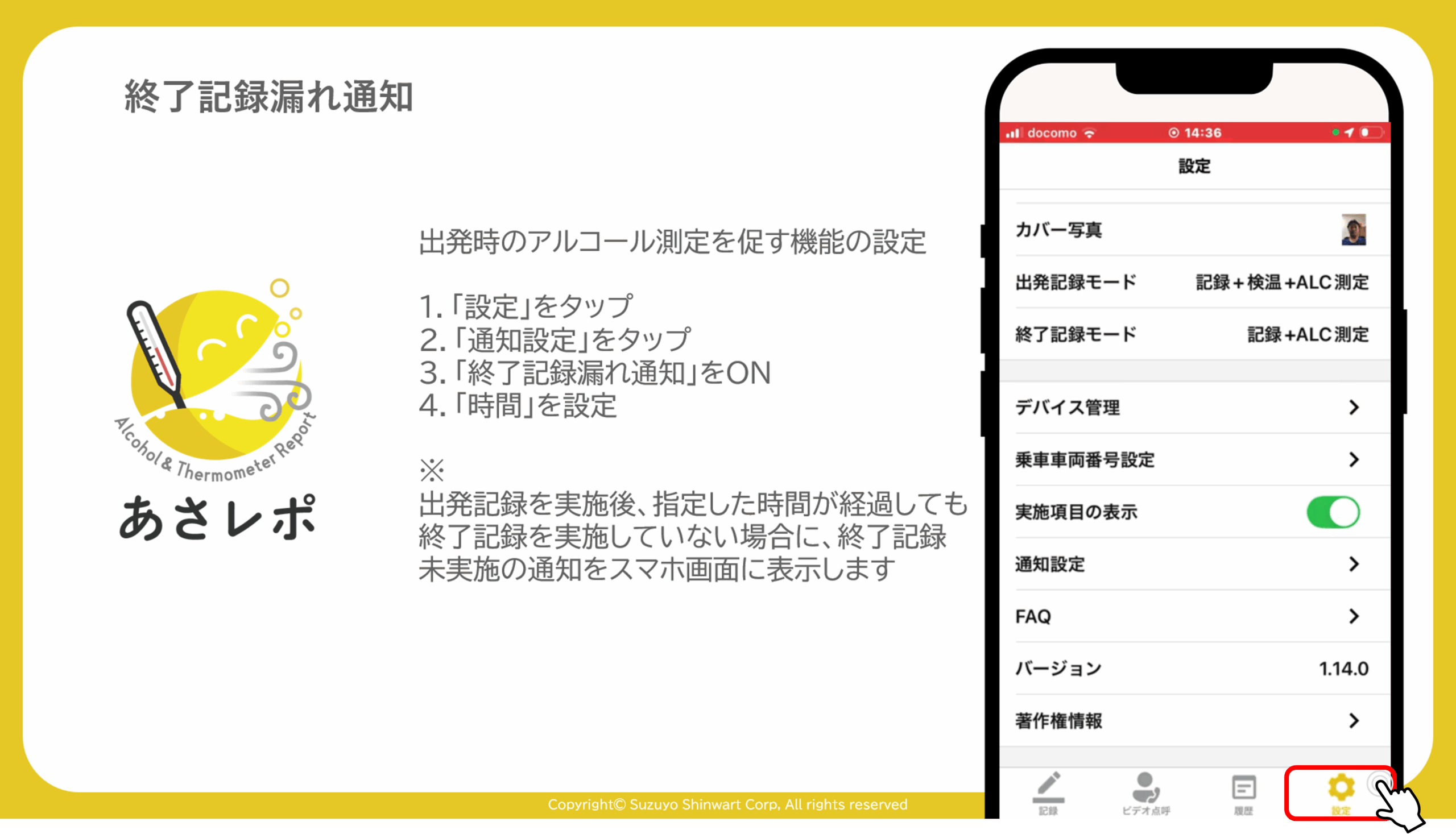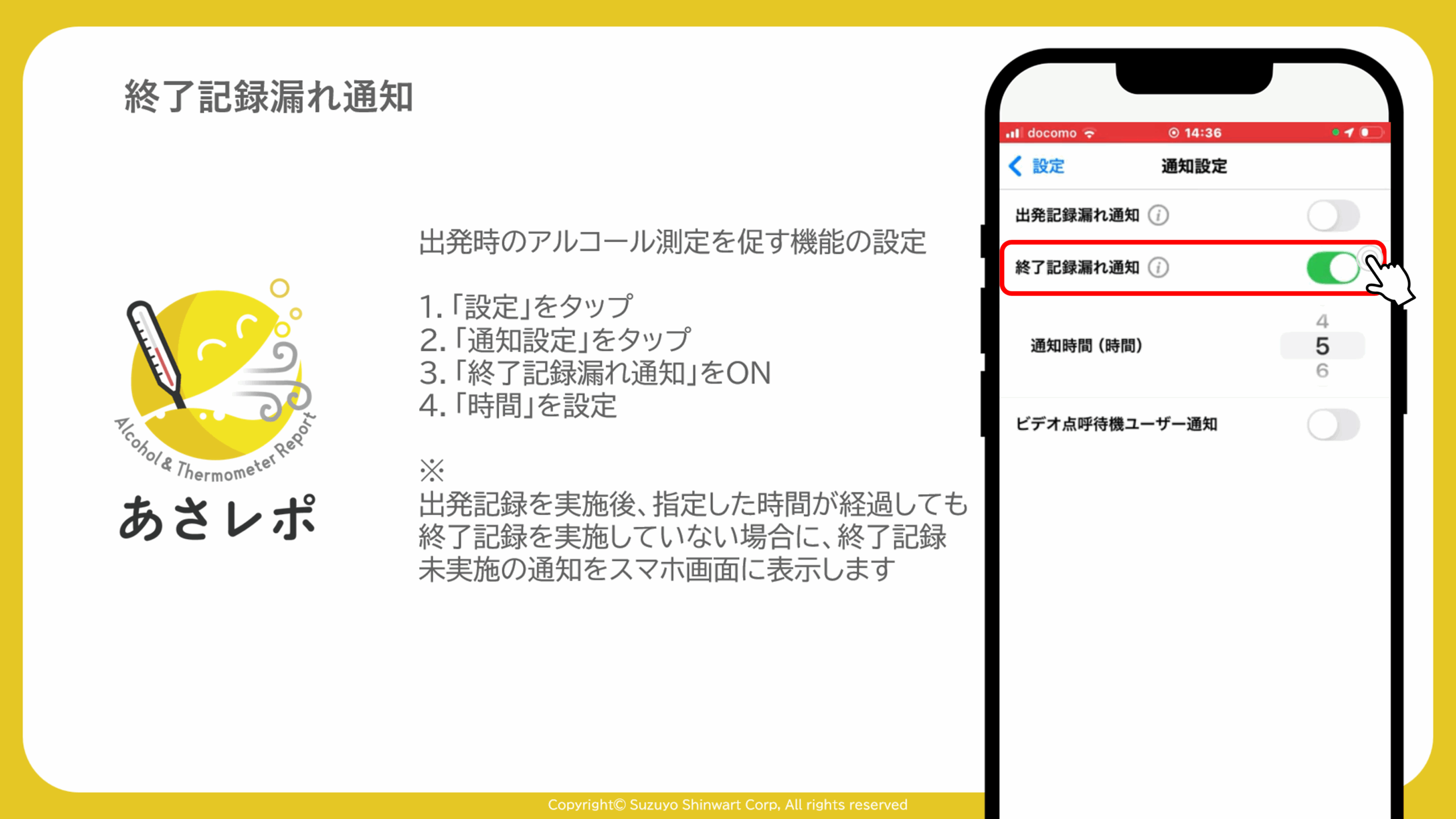 4.「業務終了時ALC測定・漏れ通知」をON