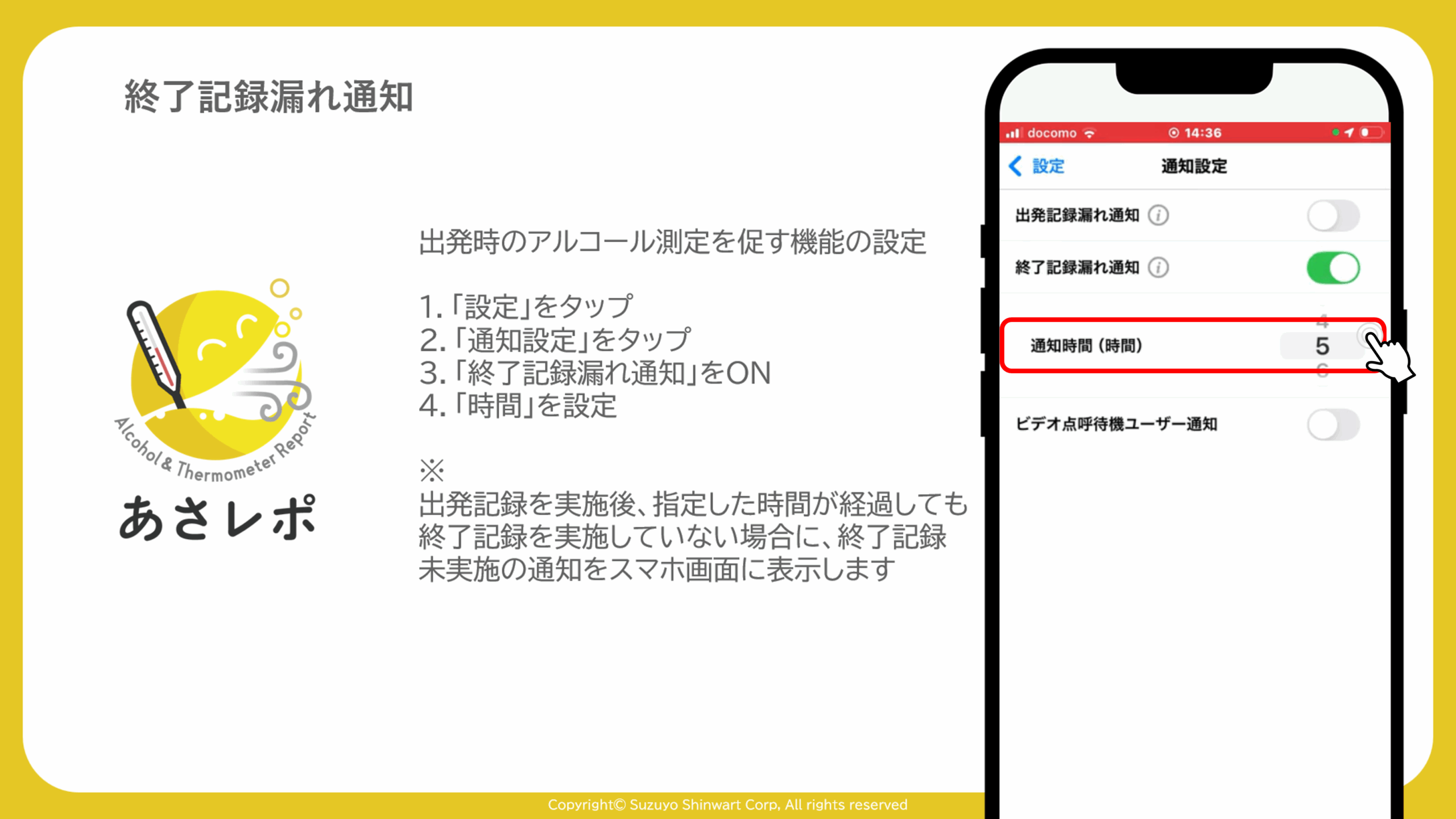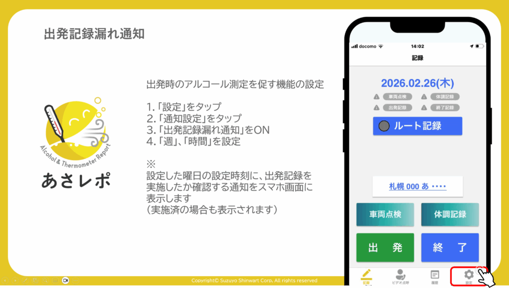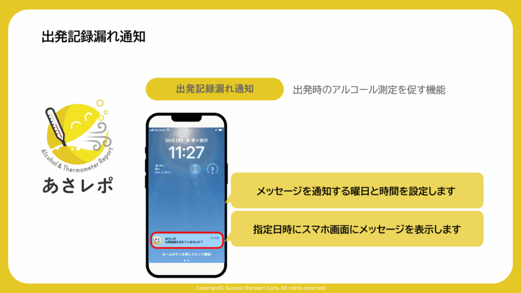 出発記録を実施後、指定した時間が経過しても終了記録を実施していない場合に、終了記録未実施の通知をスマホ画面に表示します