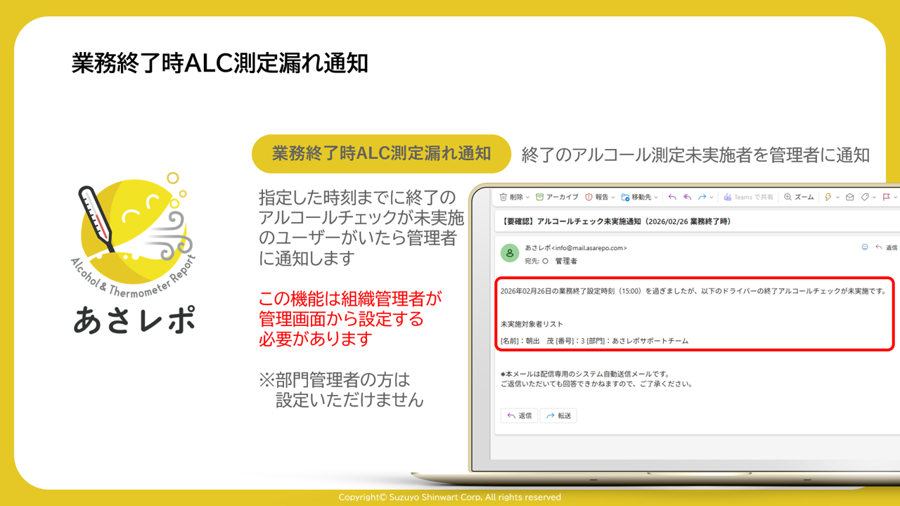 終了のアルコール測定未実施者を管理者に通知
