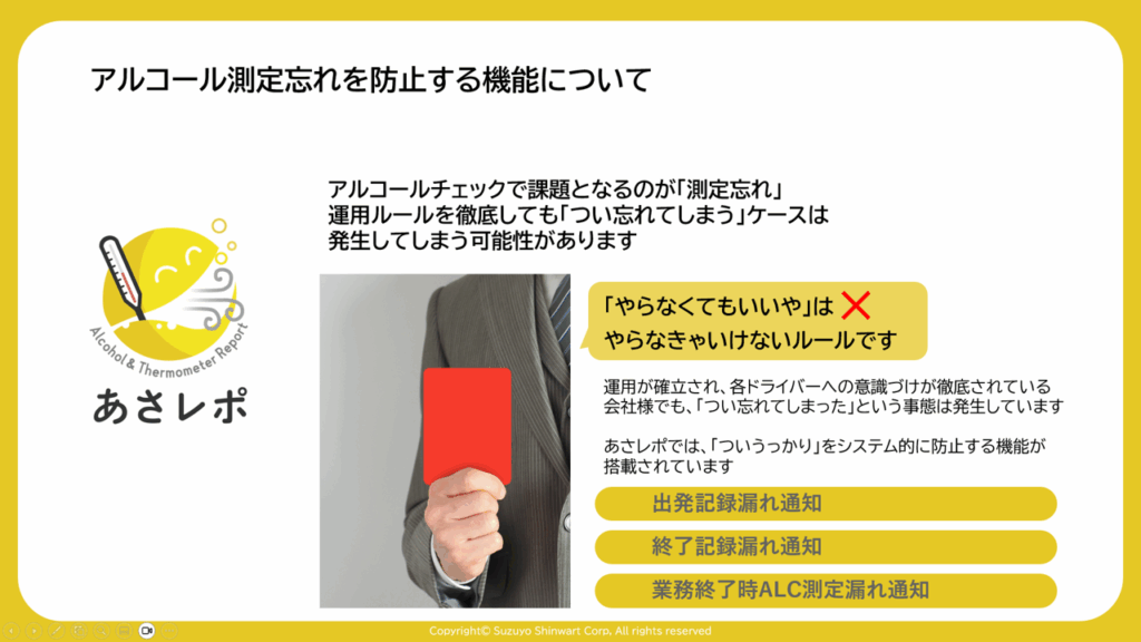 アルコールチェックで課題となるのが「測定忘れ」。運用ルールを徹底しても「つい忘れてしまう」ケースは発生してしまう可能性があります