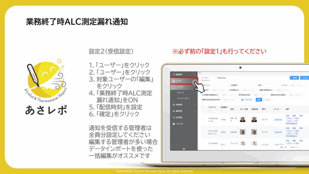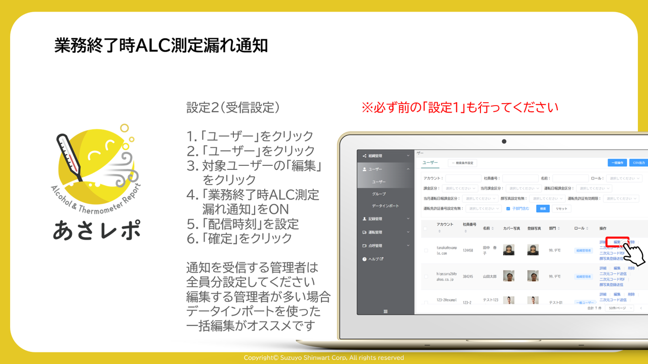通知を受信する管理者は全員分設定してください。編集する管理者が多い場合データインポートを使った一括編集がオススメです