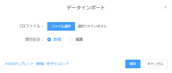 | 保存 選択したファイルをアップロードします この段階ではCSVファイルは適用されません(管理サーバにアップロードされるだけ) キャンセル 何もせず画面を閉じます |